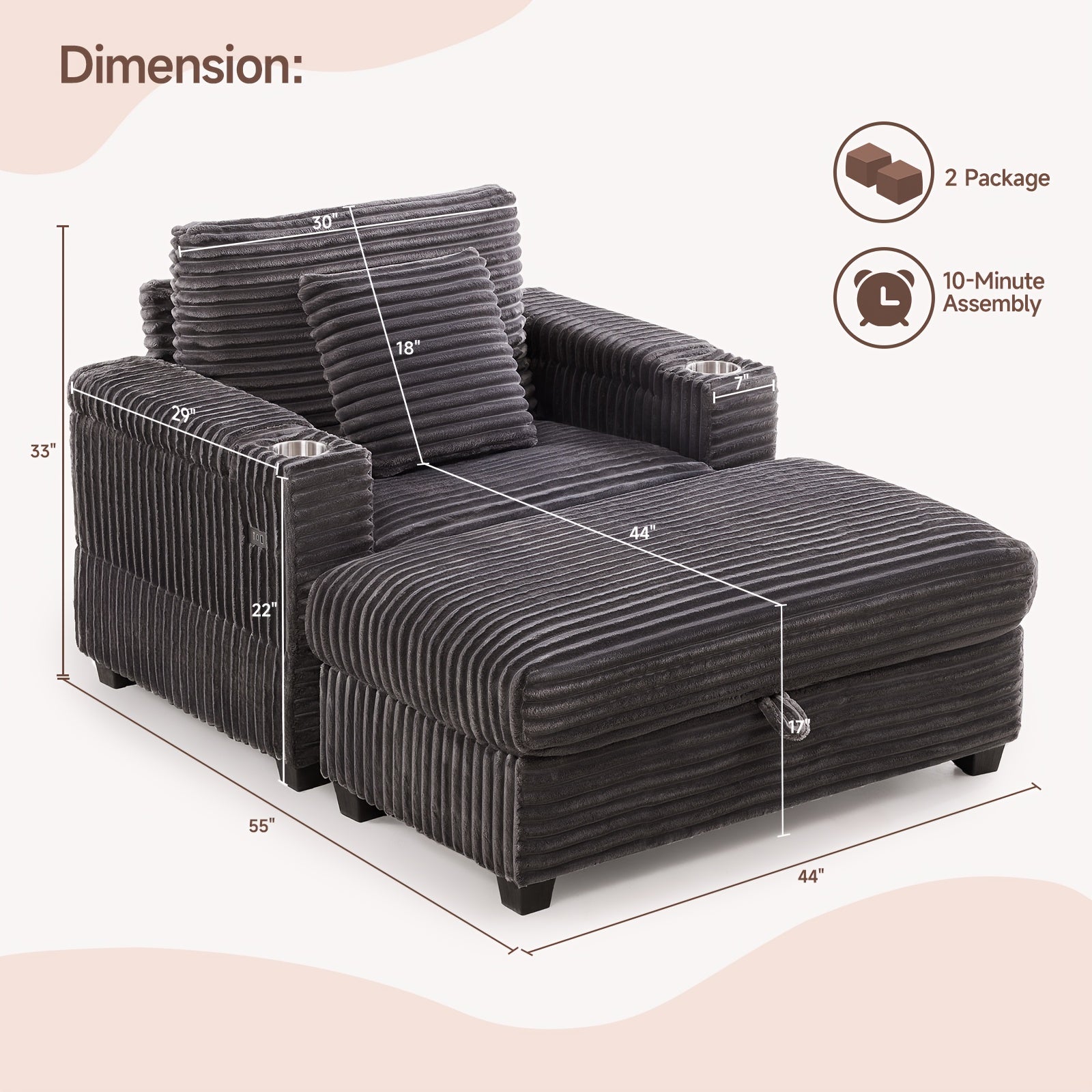 Modern Corduroy Reading Chair With Storage Ottoman And USB